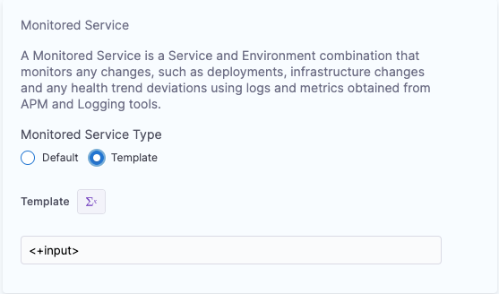 To select a monitored service template, select Template under Monitored Service > Monitored Service Type in the Verify step configuration page. The template input can be a fixed value or runtime input.