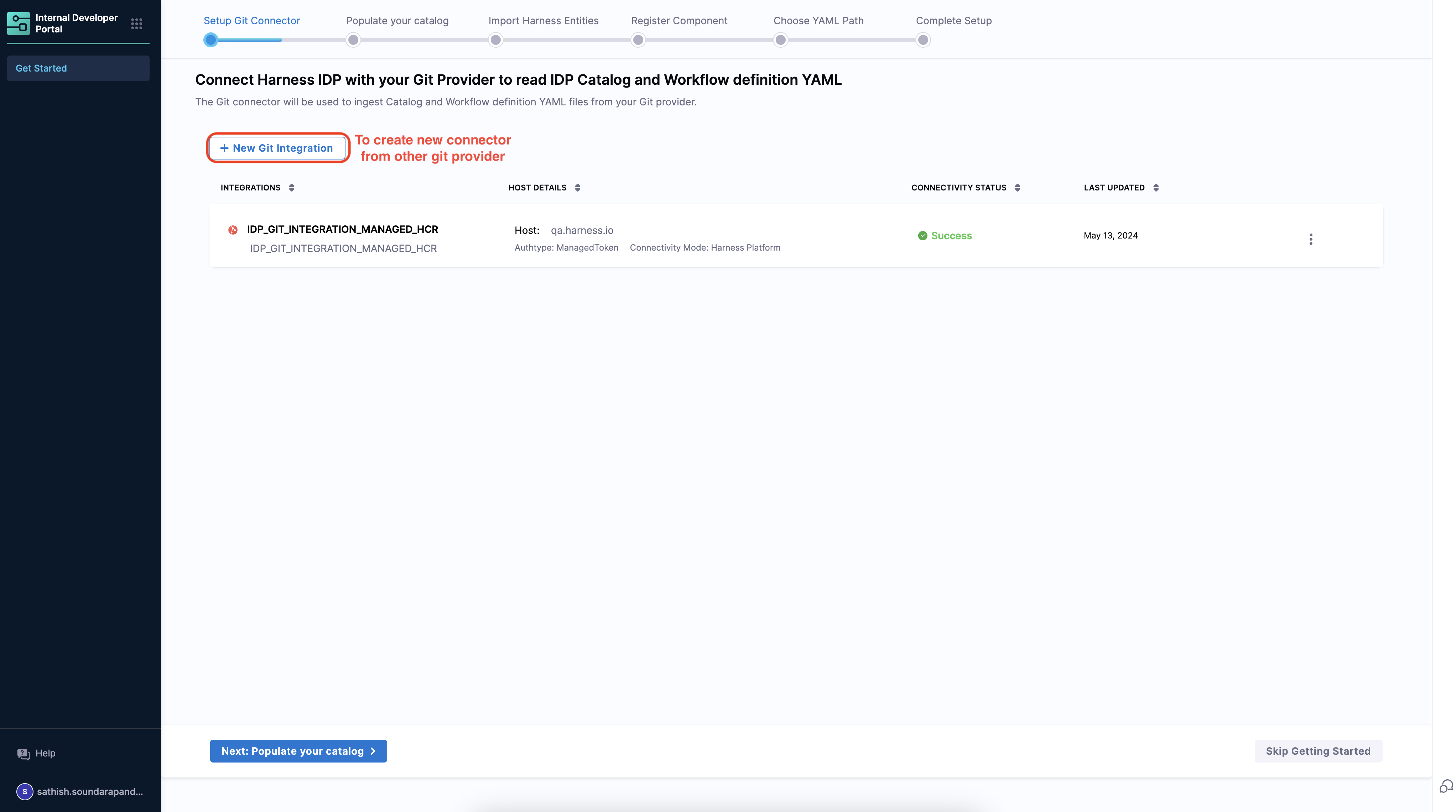 1. You can as well create a new connector for other git-providers under the +New Integration. If you already have a connector available which you want to use in IDP to save your catalog-info.yaml, then select the connector under Select Git Connector, use a URL to validate and save the connector. If you don't have your connector configured already follow the steps mentioned below.