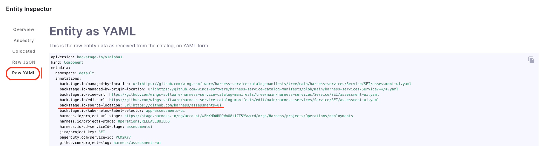 Catalog -> Software Component -> Inspect Entity -> Raw YAML